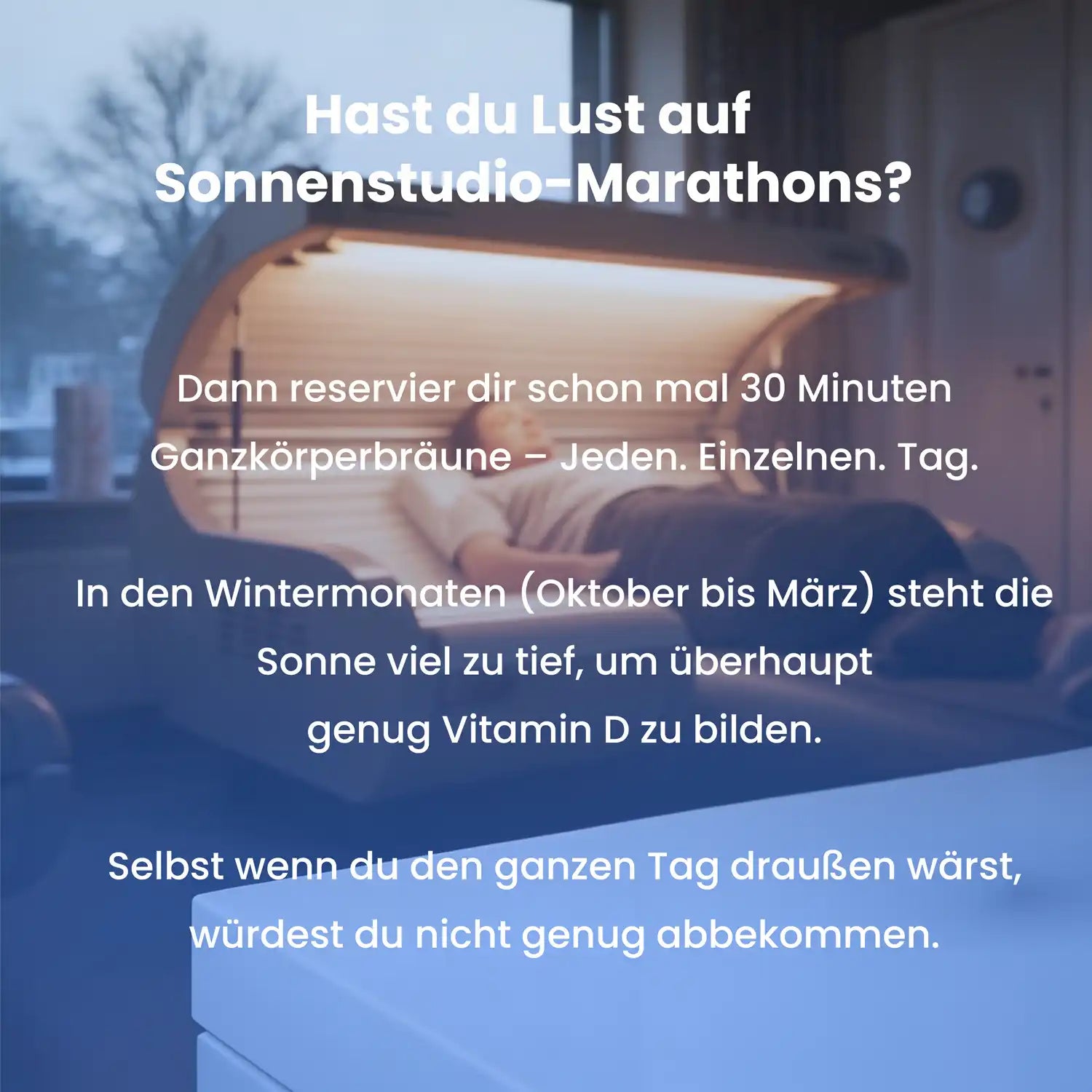 Deutschland liegt zwischen dem 47. und 55. Breitengrad – von Oktober bis März ist die UV-Strahlung zu schwach für die Vitamin-D-Produktion. Selbst im Sommer schaffen wir es kaum: Büroarbeit, Kleidung, Sonnencreme blockieren die Sonnenstrahlen. Das Ergebnis: 60% der Deutschen haben laut Studien einen suboptimalen Vitamin-D-Spiegel.